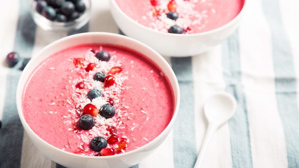 Cho tất cả nguyên liệu vào máy xay, xay nhuyễn cho đến khi thu được hỗn hợp mịn. Đổ hỗn hợp ra bát, trang trí lên trên bằng quả việt quất hạt lựu và dừa khô nếu muốn.