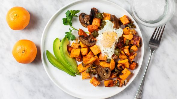 Đặt một cái chảo lớn trên lửa vừa. Thêm dầu, hành tây và khoai lang vào nấu, thỉnh thoảng khuấy đều. Đậy nắp và nấu cho đến khi khoai lang mềm và hơi cháy, khoảng 12 đến 14 phút. Thêm nấm, ớt chuông, muối và tiêu đen vào nấu thêm 5 đến 7 phút nữa cho đến khi nấm chín. Đập trứng vào chảo và nấu cho đến khi đạt được độ đặc mong muốn. Để nguội và ăn kèm với lát bơ.