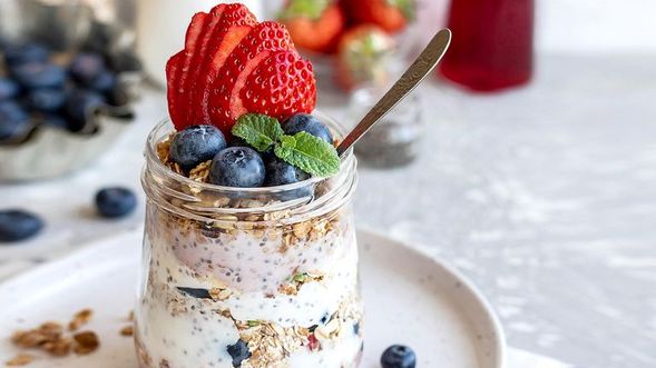 Cho sữa chua, sữa, chuối nghiền, yến mạch, hạt chia vào tô và trộn đều. Chia hỗn hợp vào các lọ có nắp đậy làm lạnh ít nhất 4 giờ hoặc qua đêm. Cho dâu tây, việt quất trang trí phía trên. Thưởng thức lạnh là ngon nhất.